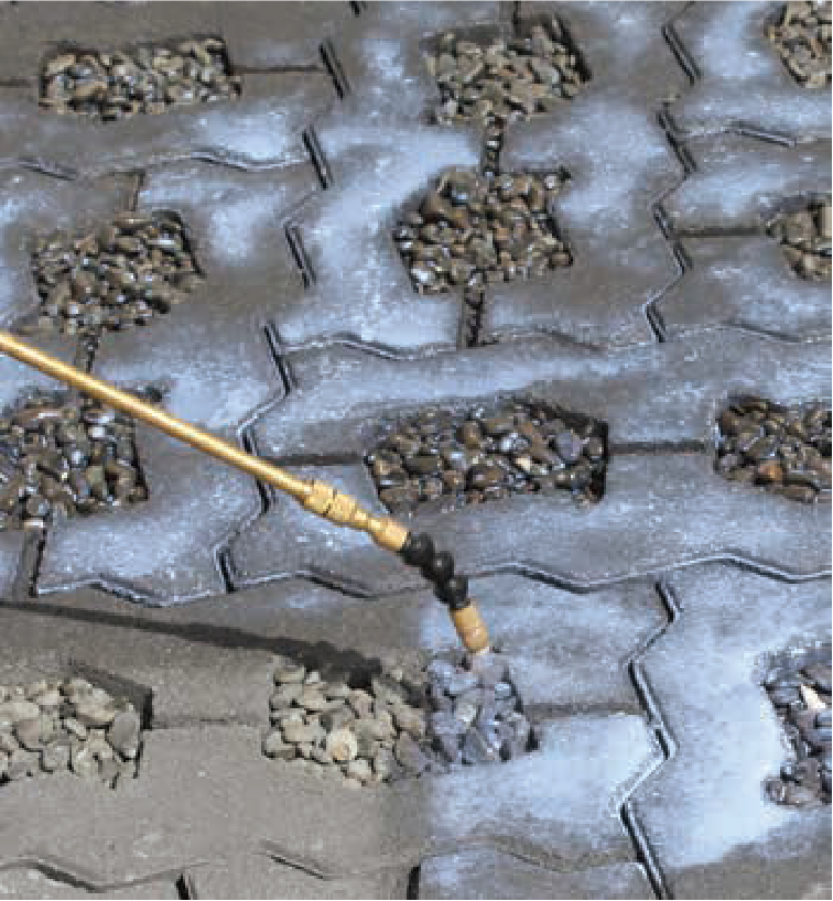 Aquabind™, which is a water-based acrylic solution with elastomeric properties designed to be used in conjunction with permeable pavement projects. Aquabind™ is a product designed to provide stability and durability to permeable pavement projects by using its elastomeric properties. It’s mixed with water at a 1:1 ratio and is used to prevent erosion of jointing chips and decorative pebbles, especially in situations where water flow or cleaning methods might pose a risk to the integrity of the pavement.